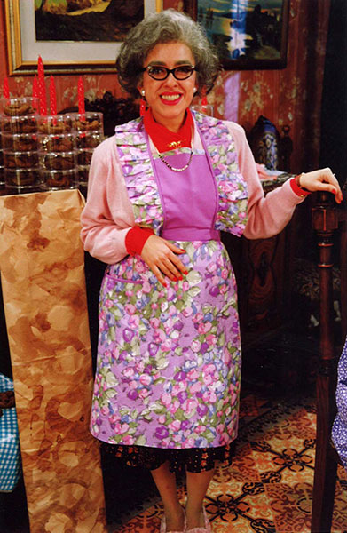 Para estar por casa la Teresina siempre busca la comodidad dentro de la corrección. Normalmente lleva un conjunto de falda, blusa y rebequita con collar y pendientes. La única cosa que varía es que durante todo el rato va con zapatillas y cuando llaman a la puerta se las quita y se pone los zapatos.