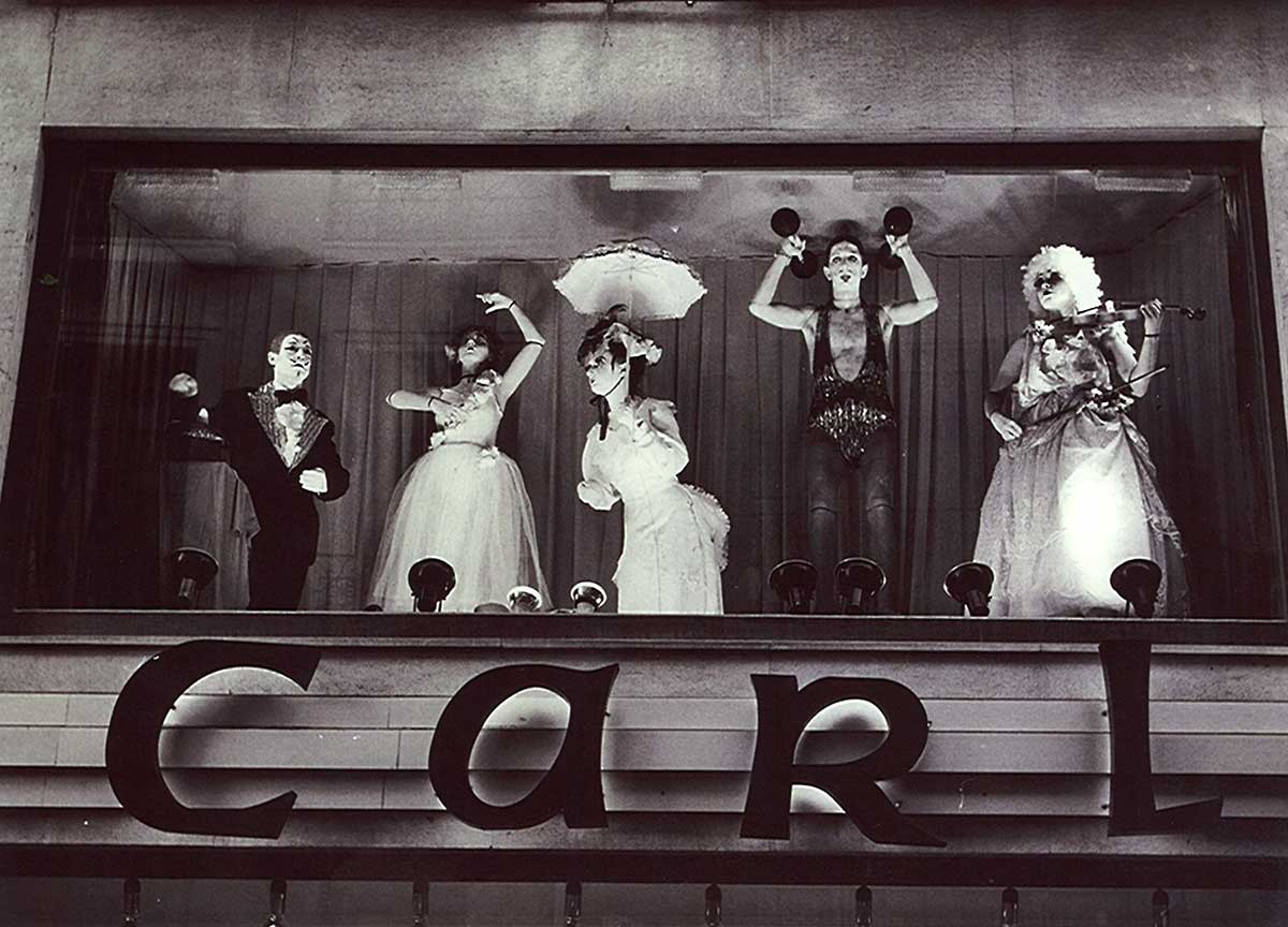 Estas acciones tenían lugar siempre dentro de los escaparates de tiendas de cierto nivel. Las gestiones para que nos dejaran los escaparates eran dignas de especialistas en engaño y diplomacia. En esa época viajábamos sólo con dos baúles un poco presentables, el resto eran cajas de cartón envueltas de precinto. Por descontado que, montando en las tiendas, no usábamos las cajas de cartón y lo que hacíamos era traspasar los objetos de las cajas a los baúles para que quedara más presentable. Cuando empezábamos el montaje en un escaparate nos hacíamos pasar por escaparatistas experimentados y ordenados como si lo hubiéramos hecho toda la vida. Después de un rato y cuando el propietario se daba cuenta de lo que se había metido en casa, ya era demasiado tarde… no se podía dar marcha atrás… Al final, la verdad es que todos quedaban contentos aunque durante el montaje y la actuación parecían sufrir bastante. Con muchos de ellos hemos mantenido una buena relación a través del tiempo.