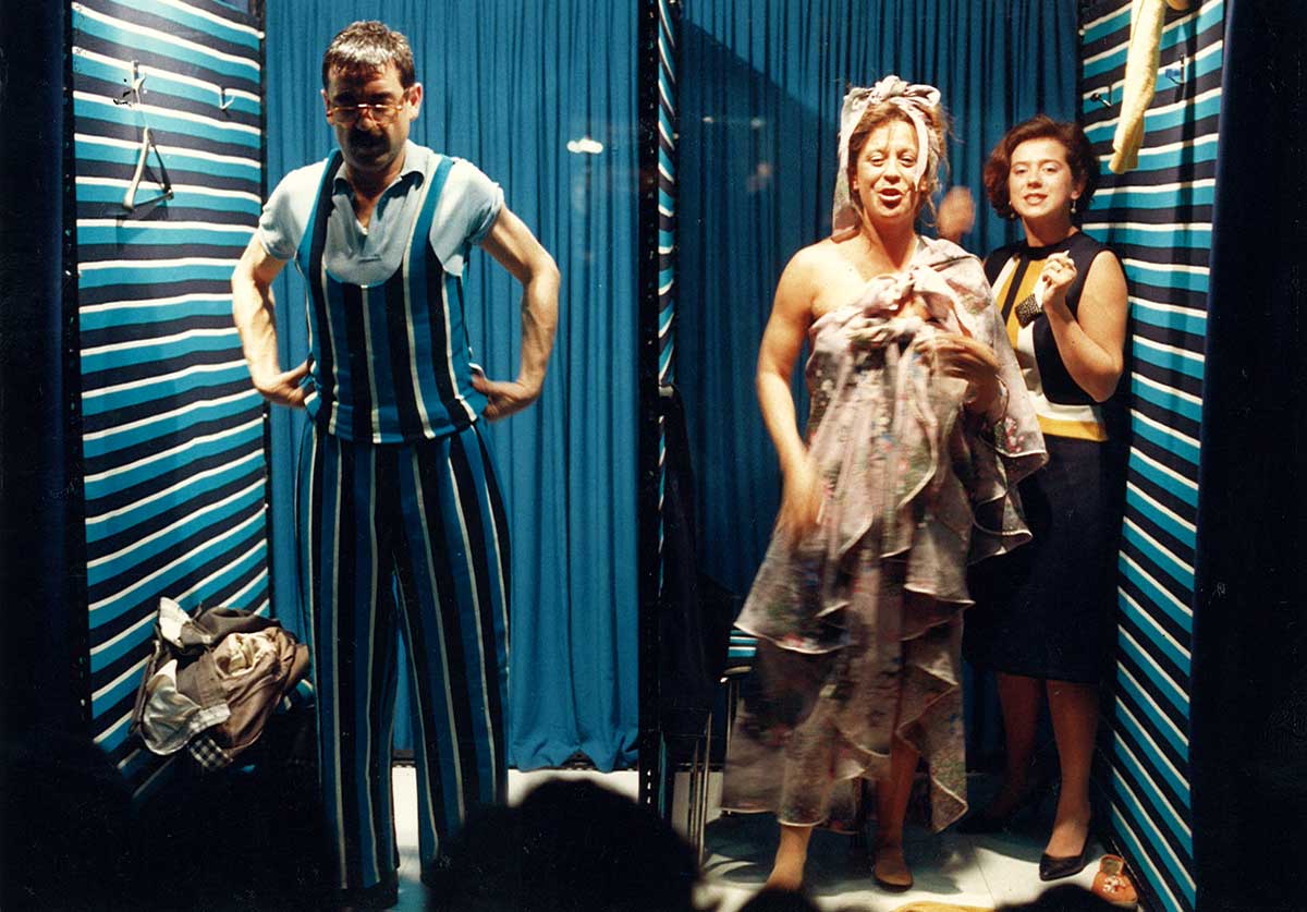 Dentro del escaparate se instala una batería de probadores de ropa de las que encontramos habitualmente en los grandes almacenes; aunque, en este caso, el vidrio que da a la calle representa ser el espejo del probador. A partir de ese momento, todo lo que pasa dentro de las cabinas es automáticamente visto desde la calle por un público ávido de voyeurismo que se deleitará mientras los clientes-actores recrean las típicas posturas y actitudes que se hacen mientras uno se prueba pantalones o camisas.