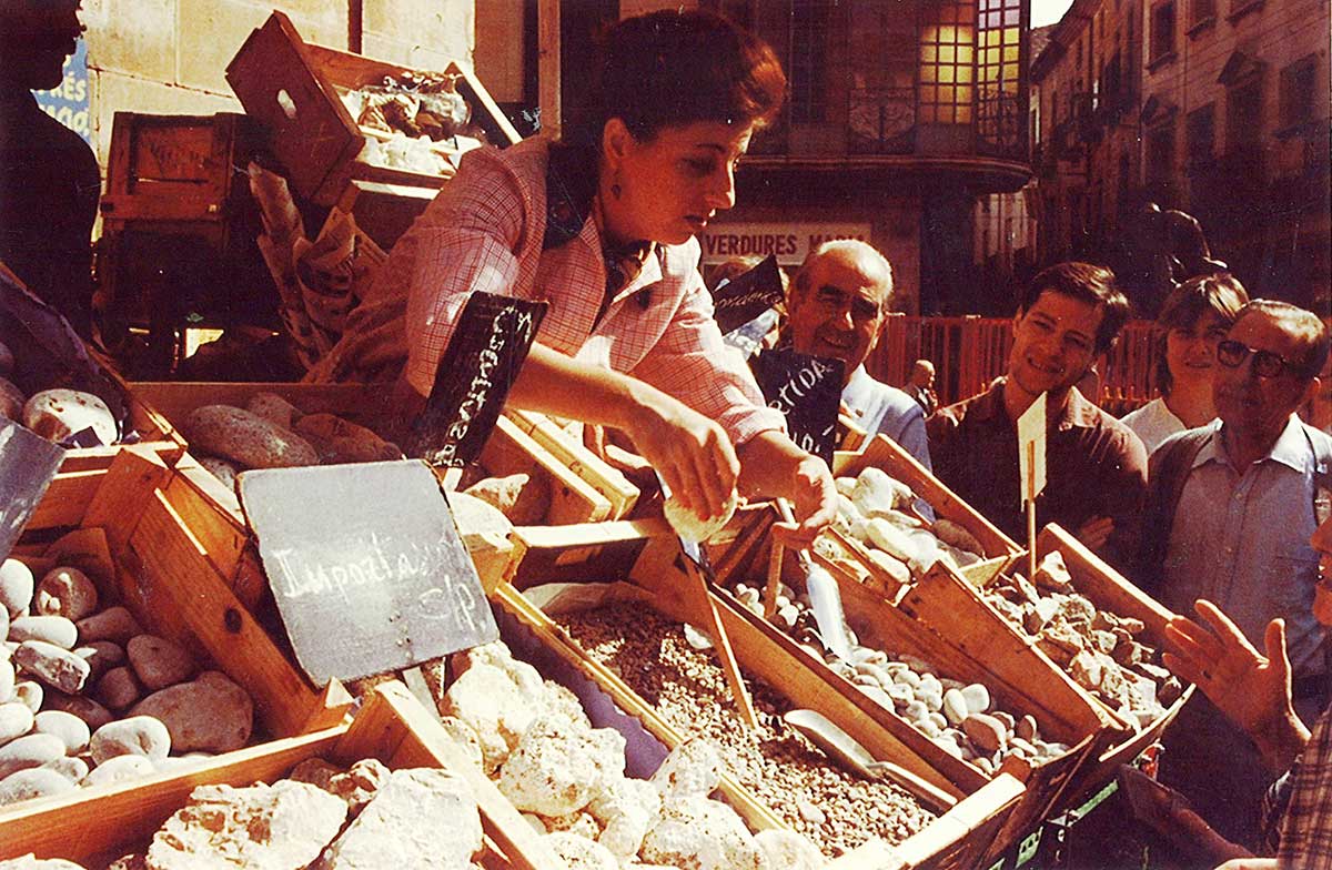 En medio de un mercado municipal y entre puestos de verduras, carne y pescado, una vendedora instala su puesto de piedras macrobióticas con virtudes curativas. Las piedras debidamente seleccionadas, clasificadas y etiquetadas quedan expuestas como si éstas fueran productos de primera calidad. La vendedora explica las excelencias de cada piedra: las hay para la memoria de los estudiantes, para los riñones, para el dolor de pies, para tener al marido siempre a punto… En definitiva, hay una piedra para todo. El público, sorprendido, pregunta y comenta. Actores mezclados entre el público comentan y compran. El público sigue el juego y también compra.