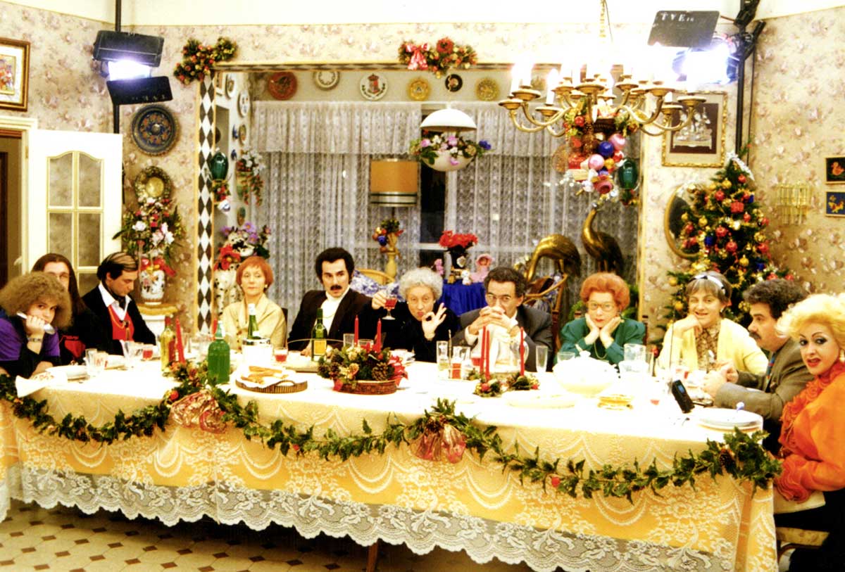 La vecindad de la escalera también quiere salir por televisión y aprovechan cualquier excusa para colarse en la cena. Al final, todos cantan un villancico de despedida, comiendo turrones y brindando con cava.